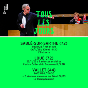 Ça sent la fin des vacances scolaires, et les prochaines représentations de « Tous les jours » notre procès du harcèlement scolaire. Le spectacle sera joué dans sa version « plateau », sortez les agendas ! ✏ 05/11/25 / 10h et 19h/ 06/11/25 / 10h et 14h30 / SABLÉ-SUR-SARTHE (72) / L’Entracte, scène conventionnée ✏ 26/03/26 / 19h30 /…